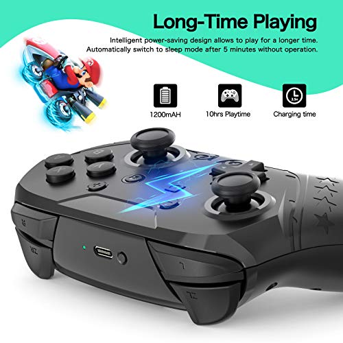 - 【Long Playtime & Ergonomic Design Remote】The battery life of the built-in rechargeable power source is amazing, requiring only 2.5 hours of charging time and up to 10 hours of playtime. It comes with a 40-inch Type-C cable, which works fine even during charging. This Pro controller uses an irregular pattern design, in addition to its beautiful, it also has the characteristics of anti-slip and anti-sweat. What's more, the Pro controller makes portable games like console games.