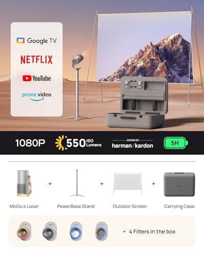 - πΆπππ πππ πͺπππππππππ πΉπππ π πππ ππποΌThis collection extends your battery life up to 5 hours with the included powerbase stand. It also includes a portable screen and a dedicated carrying case, offering a complete solution for big-screen entertainment wherever you go.(Includes: MoGo 4 Laser Projector, PowerBase Stand, 70" Portable Screen, 4 Magnetic Filters, and Carry Case)