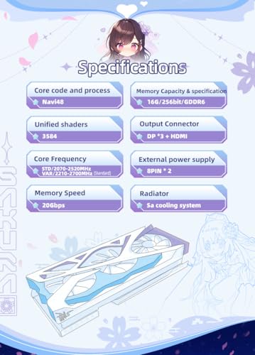 - Fan features: 6Pin, adjustable speed, display speed value Fan speed: 3000 Bus interface: PCI Express 5.0 x16 Encoding/decoding features: 4K H264 decoding/encoding, H265/HEVC decoding/encoding, AV1 decoding/encoding Output interface: DP (2.1a) * 3+HDMI (2.1b) Maximum resolution: 7680 * 4320 (DP&HDMI) Sli/Crossfire: Not supported Power supply design: 11+3 phases External power supply: 8PIN * 2 (recommended power supply above 750W)